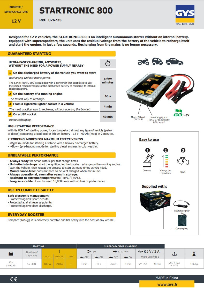 Designed for vehicles fitted with a 12 V battery, this booster is equipped with supercapacitors and uses the residual voltage of the vehicle's battery to recharge and start the engine in a matter of seconds.